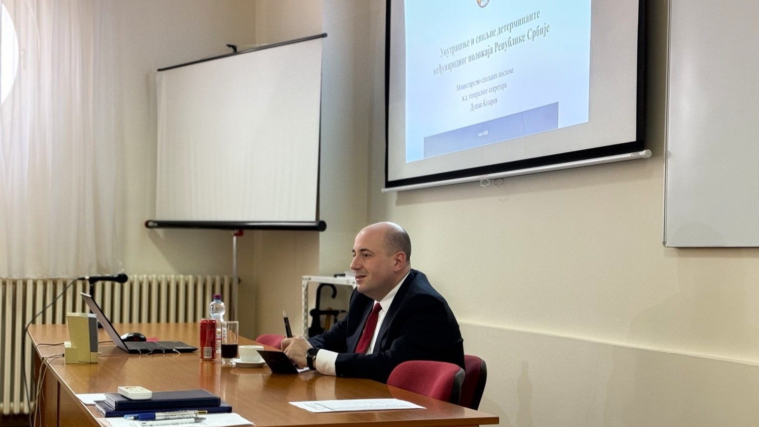 Козарев је представио кључне унутрашње и спољне детерминанте међународног положаја Републике Србије, са освртом на спољнополитичке приоритете земље и савремене глобалне изазове. Посебно је указао на актуелну ситуацију у нашој јужној покрајини, указујући на проблеме са којима се Срби суочавају, као и на заједничку обавезу доследног залагања за поштовање међународног јавног права.