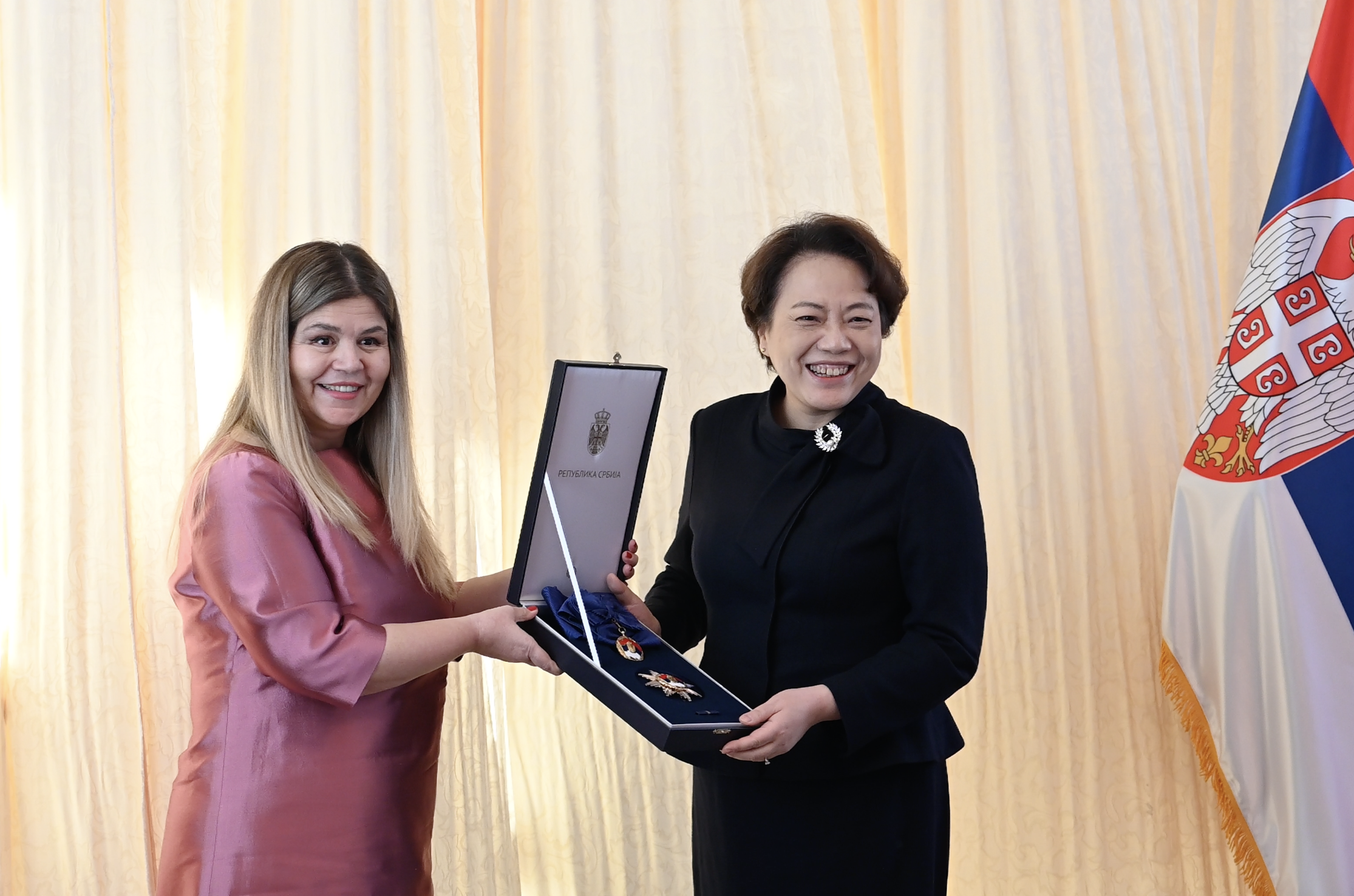 U prostorijama Ambasade Republike Srbije u Pekingu upriličena je svečanost dodele državnih odlikovanja, koja je predsednik Srbije Aleksandar Vučić dodelio kineskim laureatima - ranijem ambasadoru Narodne Republike Kine u Srbiji Čen Bo i profesorima sa Katedre za srpski jezik Pekinškog univerziteta za strane studije Jao Đijeu i Peng Jučaou.