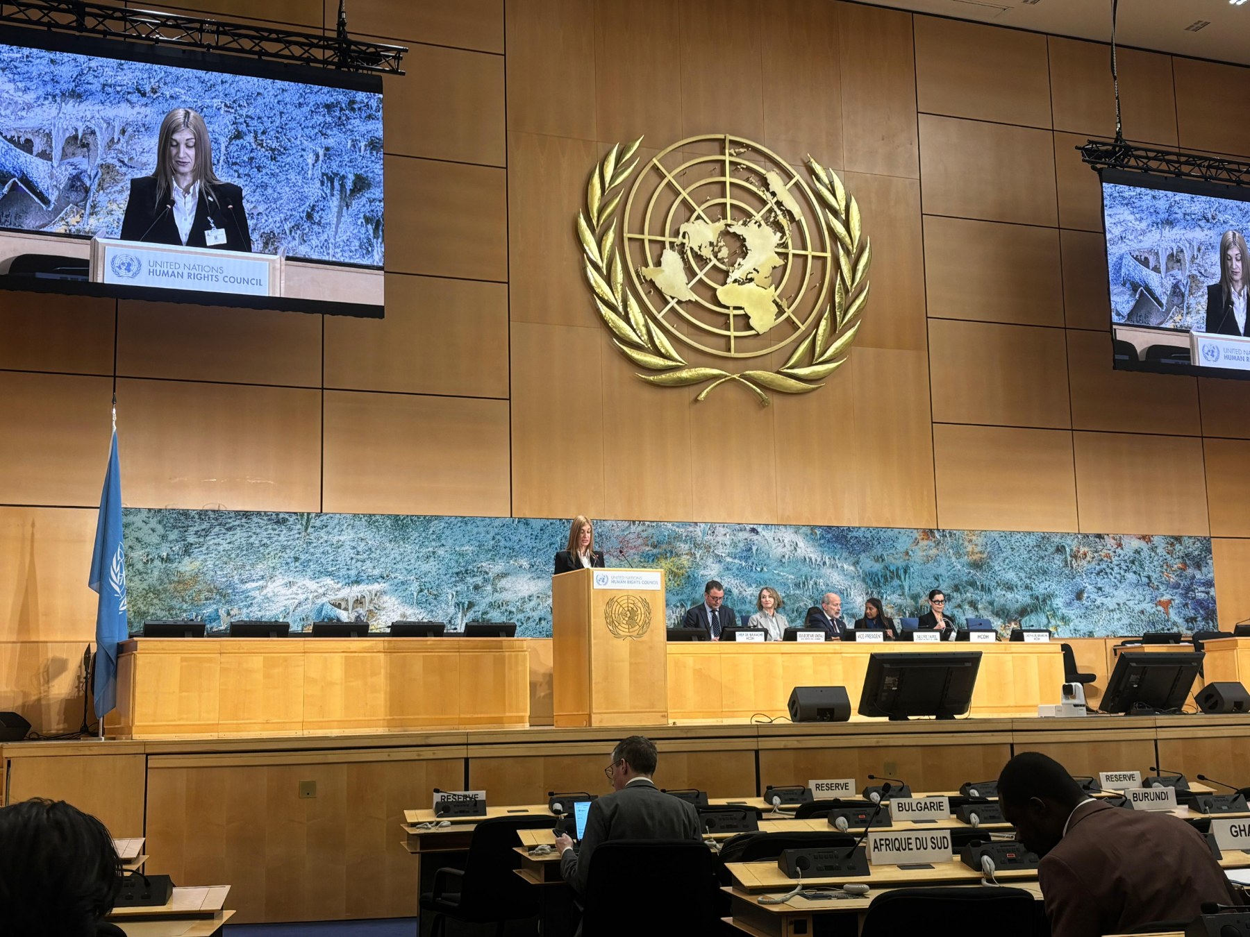 Говорећи о приоритетима у области људских права на националном нивоу, државна секретарка је истакла да Република Србија наставља да унапређује институционални и законодавни оквир у области људских права, као и механизме заштите од дискриминације, са посебном пажњом усмереном на заштиту права осетљивих друштвених група, укључујући децу, жене, особе са инвалидитетом, избеглице, интерно расељена лица и припаднике националних мањина.