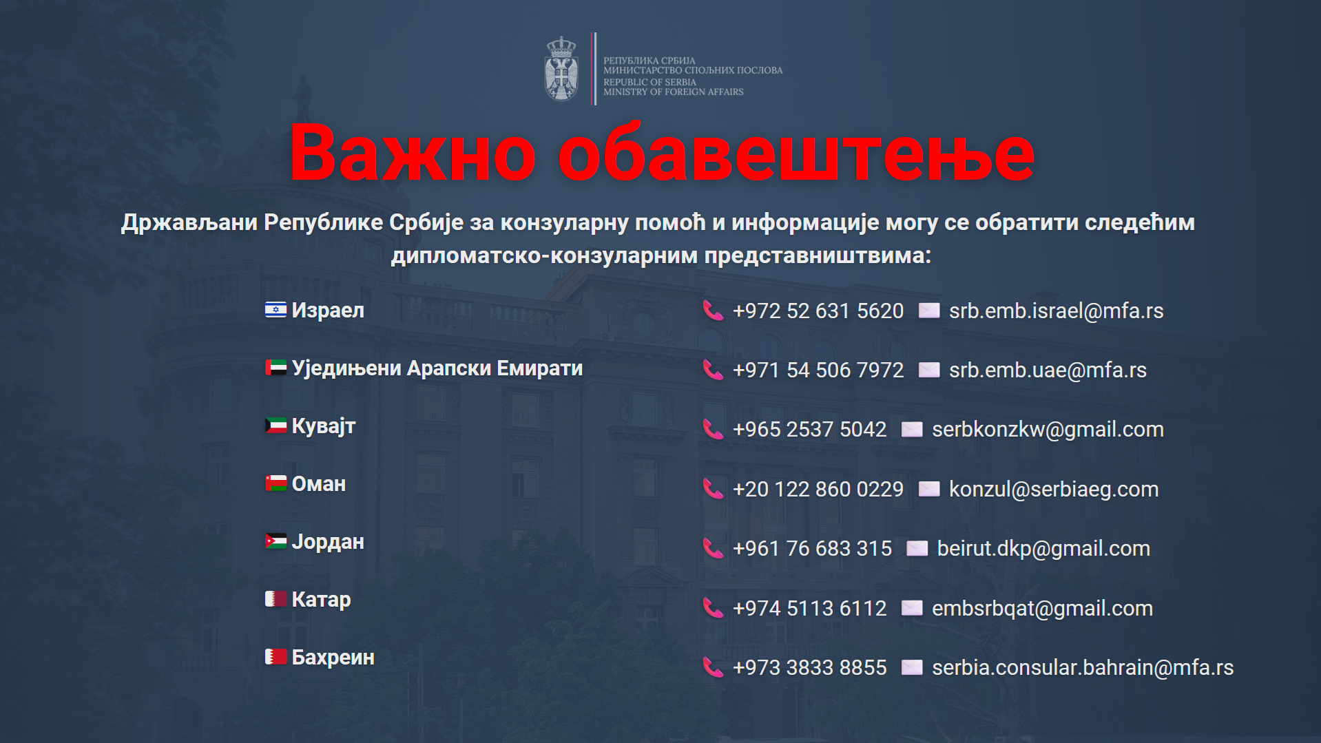 Državljani Republike Srbije koji se nalaze u regionu Bliskog istoka, radi konzularne pomoći i dobijanja dodatnih informacija, mogu se obratiti sledećim diplomatsko-konzularnim predstavništvima: