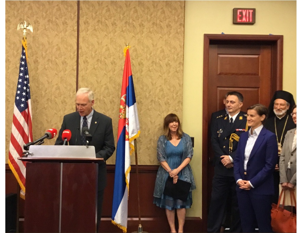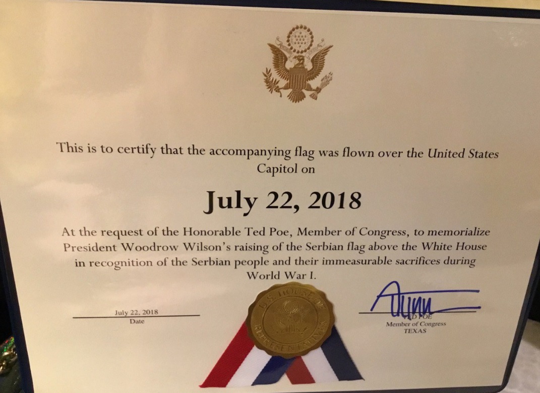 О свечаном пријему у Конгресу САД, поводом обележавања стогодишњице од подизања српске заставе на Белој кући, писао је „Медијум", портал организације „ДЦ ембаси ивентс", која прати дипломатска дешавања у Вашингтону. Портал пише да је Краљевина Србија у Првом светском рату изгубила 60 одсто мушке популације и преноси Вилсонове речи пијетета према страдању Срба.