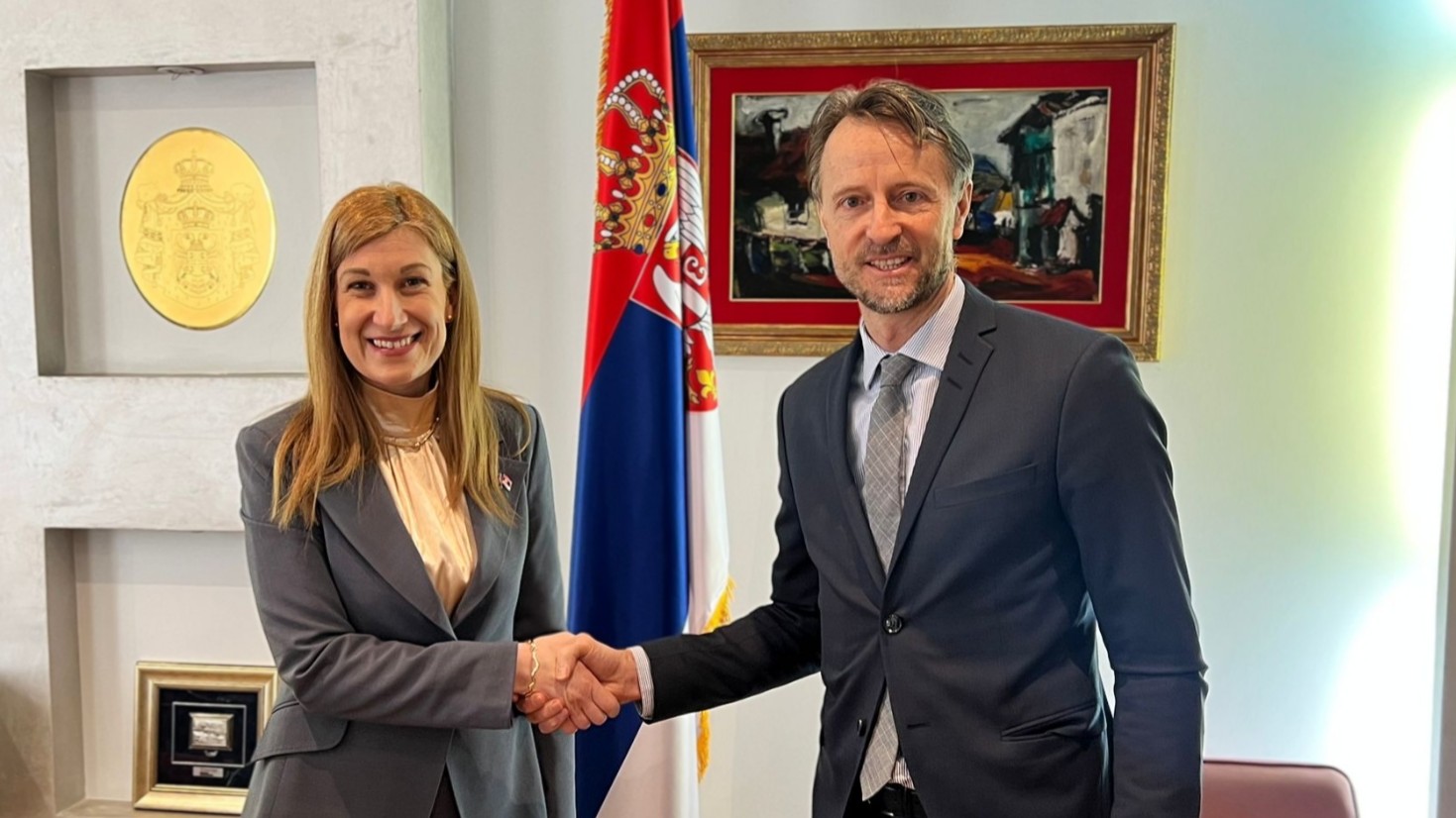 Јовановић је, такође, искористила прилику да саговорника информише о актуелној ситуацији на Косову и Метохији, указујући на изражене безбедносне и институционалне изазове са којима се суочава српско становништво. Посебна пажња скренута је на мере и најављена регулаторна решења Приштине која додатно отежавају свакодневни живот Срба и негативно утичу на остваривање њихових основних права, укључујући право на рад и слободу кретања. У том контексту, Јовановић је истакла значај појачаног ангажмана Европске уније у циљу очувања мира, стабилности и стварања услова за наставак дијалога.